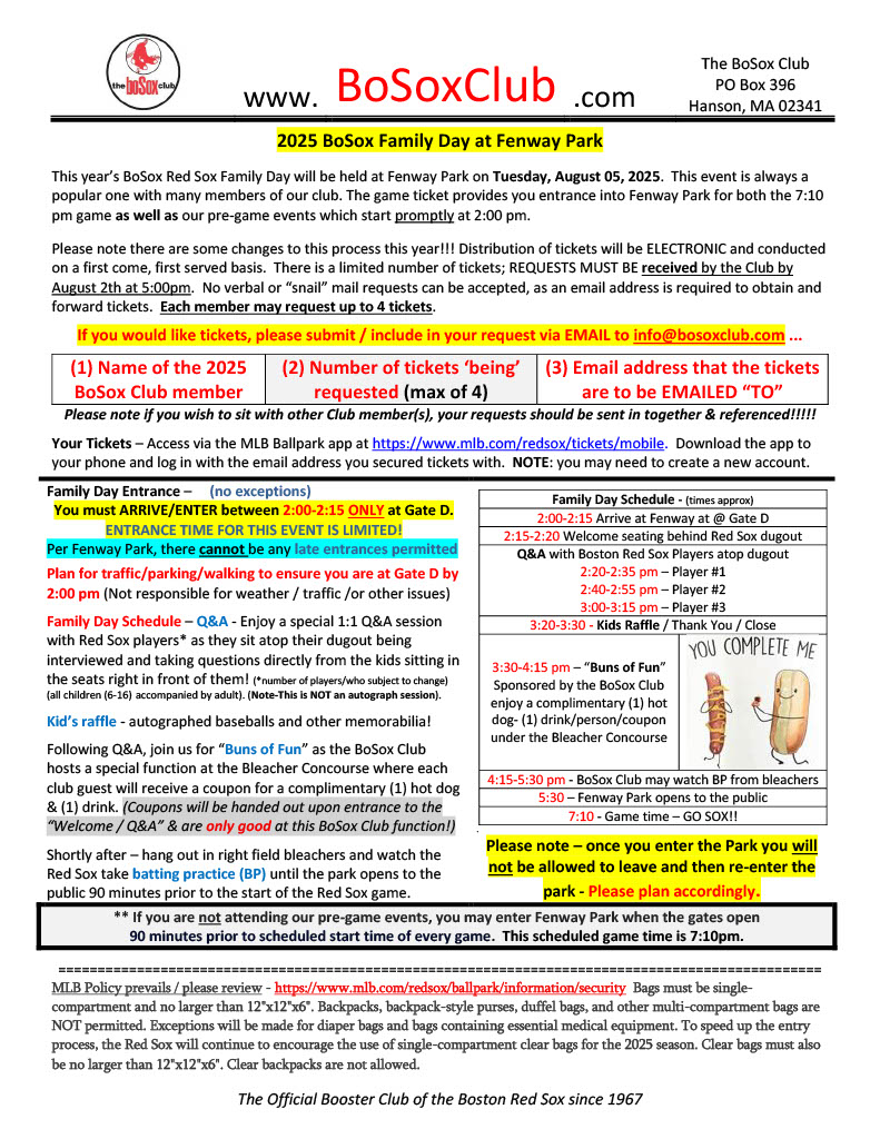 Family Day Schedule Family Day entrance –MUST ARRIVE 2:00-2:15 ONLY at Gate D. Per Red Sox – NO access to pre-event will be permitted after this time! PLAN extra time for travel / parking / walk to ensure you are at Gate D by 2:00 pm (Not responsible for weather / traffic / or other issues).(Regular gates open public 90 minutes prior to game) Enjoy a special 1:1 Q&A session with Red Sox players as they sit atop their dugout – kids sit in seats right in front of them!(all children (6-16) accompanied by adult). (Note-This isn’t an autograph session). A children’s raffle with signed baseballs / memorabilia items will be held! Immediately following, there is a BoSox Club special function where each guest may use a coupon to receive a complimentary hot dog & drink prior to batting practice (only). (coupons to be handed out upon entrance to the “Welcome / Q&A”)Then, hang out in right field and watch the Red Sox take batting practice (BP) prior to the park’s opening to the general public. |